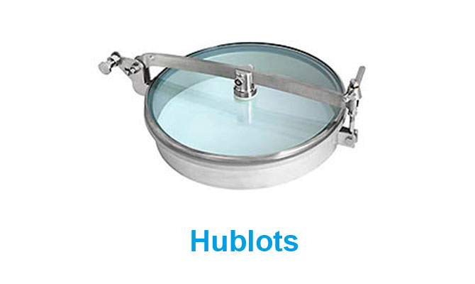 HUBLOT DN100 selon DIN28121 / | HUBLOT POUR CUVE DN100 INOX BRIDES PN 6 DIN 28120 VERRE EN SILICATE DE SOUDE selon DIN 8902 1 bride à souder, qualité 1.4404 (AISI 316L) selon EN 10204, 3.1 (B) AD-W2 1 bride couvercle, qualité 1.4541 (AISI 321) selon EN 10204, 3.1 (B) AD-W2 Température max | HUB100BLA |